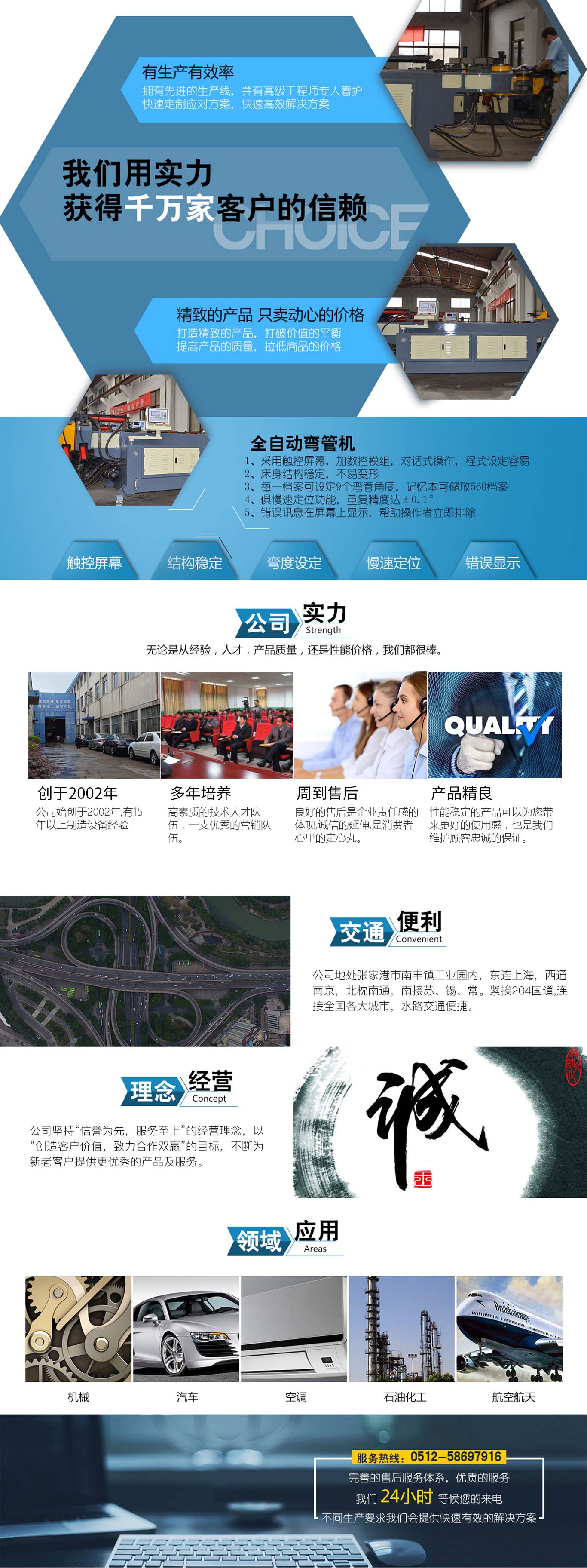 張家港市雙和機(jī)械制造有限公司始建于2001年,占地面積12000平方米,南鄰蘇州、無錫、上海,東鄰常州、南京,交通便利,位長三角中間地段,風(fēng)景優(yōu)美的張家港。 雙和公司至創(chuàng)立開始,引進(jìn)了國外的設(shè)計(jì)制造理念,組建了企業(yè)生產(chǎn)管理優(yōu)秀團(tuán)隊(duì),致力于管材加工機(jī)械研發(fā)、設(shè)計(jì)、制造。創(chuàng)新的設(shè)計(jì)理念,嚴(yán)格的質(zhì)量把關(guān),專業(yè)的售后服務(wù),不斷提升了我在整個行業(yè)的影響力。 雙和公司生產(chǎn)的系列產(chǎn)品分為彎管機(jī)、切管機(jī)、縮管機(jī)、磨齒機(jī)、伺服彎管機(jī)、數(shù)控彎管機(jī)、液壓彎管機(jī)、自動切管機(jī)、管端成型機(jī)、倒角機(jī)、大弧滾圓機(jī)、鋁切機(jī)、壓彎機(jī)等管材加工機(jī)械,廣泛用于航天業(yè)、造船業(yè)、汽車制造、鍋爐制造、自行車、摩托車、體育健身器材、管制品家...